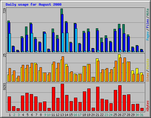 | Day | Hits | Files | Pages | Visits | Sites | KBytes | ||||||